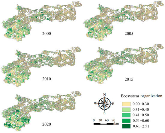 Ecosystem organization refers to the stability of the ecosystem, which is evaluated through landscape heterogeneity and landscape connectivity at the village unit level. Landscape heterogeneity is quantified using the Shannon Evenness Index (SEI) and the Mean Patch Fractal Dimension (MPFD). Landscape connectivity is calculated by assessing the connectivity of rural landscape units and the connectivity of patches that serve important ecological functions. The specific calculation formula for landscape organization is referenced in [21]. The calculations of SEI, MPFD, and landscape connectivity at the village unit level are conducted using Fragstats 4.2 software.