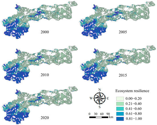 The average value of ecosystem organization in the Zheng–Bian–Luo rural areas experienced a slight increase from 0.31 in 2000 to 0.33 in 2020. The proportion of villages with ecosystem organization below the average decreased from 68.23% in 2000 to 64.70% in 2020. Spatially, the ecosystem organization level in the southwestern rural areas of Luoyang slightly increased over the twenty-year period, while other areas remained relatively stable (Figure 7). Overall, there was a decline in ecosystem resilience during the twenty-year period, with the average value decreasing from 0.42 in 2000 to 0.39 in 2020. Spatially, aside from minor changes near the Songshan Mountains close to Zhengzhou, the distribution of ecosystem resilience remained largely unchanged from 2000 to 2020 (Figure 8).
