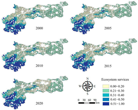 There was a slight increase in the average value of ecosystem services from 0.25 in 2000 to 0.26 in 2020 (Figure 9). Spatially, the high-value areas are primarily situated in the forested mountainous regions of Luoyang, the southern mountain forest areas of Xin’an County, and near the Songshan Mountains at the border of Zhengzhou and Luoyang. These areas exhibit notable heterogeneity and maintain a high level of consistency with the spatial pattern of ecosystem resilience.