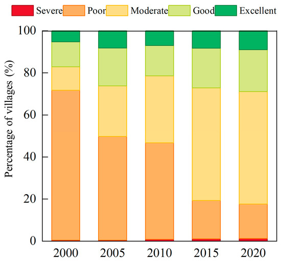 In terms of temporal analysis, the average ecosystem health indices for 2000, 2005, 2010, 2015, and 2020 were recorded as 0.32, 0.34, 0.33, 0.35, and 0.35, respectively. These findings indicate a generally stable condition with a slight upward trend. Throughout the study period, an average of approximately 70% of villages in the Zheng–Bian–Luo rural area had ecosystem health indices below the average values. The proportions of villages with severe health levels were found to be 0.49%, 0.47%, 0.87%, 1.09%, and 1.24% for 2000, 2005, 2010, 2015, and 2020, respectively (Figure 6). These results suggest that the prevalence of severe health levels was relatively low and exhibited a decreasing trend. Furthermore, the percentages of villages with poor health levels showed a consistent decline from 71.28% in 2000 to 16.40% in 2020, with the highest proportion observed in 2000. The changes in poor health levels between 2005 and 2010 and 2015 and 2020 were relatively gradual, whereas there was a significant decrease of over 20% in health levels between 2000 and 2005 and 2010 and 2015. The proportions of villages with moderate health levels were 11.12%, 24.02%, 31.83%, 53.54%, and 53.44% for 2000, 2005, 2010, 2015, and 2020, respectively. Notably, there was a substantial increase in the percentage of villages with moderate health levels, particularly between 2010 and 2015. The proportions of villages with relatively good health levels were 11.86%, 17.97%, 14.42%, 18.79%, and 19.87%, indicating an initial increase, followed by a decrease, and ultimately another increase, with approximately one-fifth of the villages reaching this level by 2020. A similar fluctuating upward trend was observed for the proportions of villages with excellent health levels, which were 5.26%, 8.25%, 7.03%, 8.33%, and 9.04% for 2000, 2005, 2010, 2015, and 2020, respectively. Moreover, the proportion of villages with excellent health levels in 2020 was approximately 1.68 times higher than that in 2000. Lastly, the proportion of villages with above-moderate ecosystem health indices displayed a continuous upward trend, increasing from 17.12% to 28.92% (Figure 10).