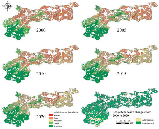 In terms of overall spatial distribution, the ecosystem health levels in the Zheng–Bian–Luo rural area exhibit significant spatial heterogeneity (Figure 11). Regions with good and excellent levels of ecosystem health are concentrated in the southeastern part of Luoyang, a small area in the north, and the hilly border area between Zhengzhou and Luoyang. Specifically, these include the southern parts of Luoning County, Luanchuan County, Song County, Yiyang County, and Ruyang County in Luoyang, the northern part of Xin’an County, and the villages near the Songshan Mountains. Generally, the mountainous and hilly areas have higher health levels, while the plains have lower health levels. Areas with severe and poor ecosystem health have significantly contracted towards the urban areas of Zhengzhou, Kaifeng, and Luoyang. By 2020, the poorly rated regions were mostly in the rural areas surrounding Zhengzhou. This spatial distribution aligns with the patterns of ecosystem resilience and ecosystem services (Figure 8 and Figure 9). From 2000 to 2020, the areas where ecosystem health deteriorated (regions with a decrease in health index) were significantly smaller than the areas where it improved (regions with an increase in health index). The areas of deterioration are mainly in the southwestern mountainous regions of Luoyang.