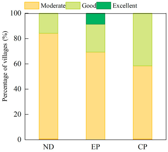Compared to the ecosystem health level in 2020, it is evident that the overall ecosystem health is highest under the EP scenario, displaying an increase of 0.02. Conversely, the ecosystem health value under the ND scenario decreases compared to 2020, while the CP scenario shows no significant change. Specifically, under the ND and CP scenarios, the proportions of villages with poor ecosystem health levels are 0.70% and 0.58%, respectively, while there are no villages with poor levels under the EP scenario. Similarly, the proportions of villages with moderate health levels under the ND, EP, and CP scenarios are 83.49%, 69.34%, and 57.81%, respectively, with the ND scenario having the highest proportion of moderate health levels. In contrast, the proportions of villages with good health levels are 15.84%, 22.01%, and 41.63%, respectively. Notably, only under the EP scenario do villages possess a proportion of 8.67% at the excellent health level, whereas no villages under the ND and CP scenarios reach the excellent health level (Figure 13).