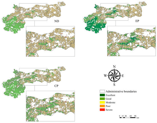 Ecosystem health accumulation map under three development scenarios. Note: ND—Natural Development; EP—Ecological Protection; CP—Cropland Protection. The same as below.
