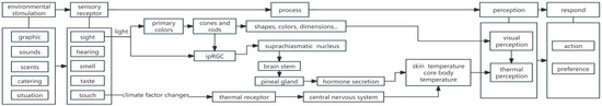 According to the theory of human eyesight effect, the formation of thermal perception can be through the visual channel of the human eye (Figure 1). The visual signals transformed by two photoreceptor cells, the optic cone and the optic rod, are transmitted through layers and information processing to perceive the visual world, distinguish the type of objects, and feel comfortable in the visual environment [52]. Under visual stimulation, there are two pathways; one is the visual pathway “light—retina—visual crossover—lateral geniculate body—cerebral cortex—visual perception—mental adaptation—thermal sensation” [53,54,55]. The other is that visual stimulation by light produces a series of physiological responses that ultimately affect thermal sensation, i.e., “light-retina-hypothalamus-superior nucleus of the optic chiasm-pineal gland-melatonin-skin temperature, core temperature-thermal sensation” [56,57,58].