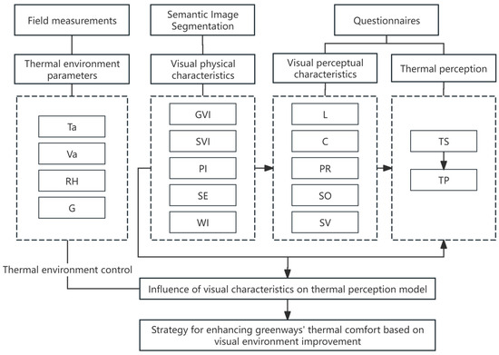 The objectives of this study were, first, to identify the key visual physical characteristics that influence thermal perception in outdoor walking environments; second, to understand how psychological and cognitive differences resulting from changes in visual physical characteristics affect thermal perception; and, finally, to construct a multilevel pathway for the influence of visual characteristics on thermal perception (Figure 2).