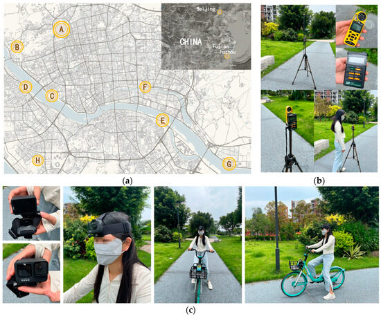 (a) A map of greenways in Fuzhou and location of Fuzhou in China; (b) thermal environment measurement; (c) video recording with GoPro.