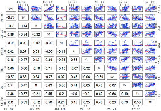Using the toolkit “magrittr”, “dplyr”, the mutate () function was used to convert discrete data to numerical data. hist (), lines (), and curve () functions were used to plot histograms, kernel density estimation curves, and normal distribution curves to complete the normality test. Our study was based on the R language and the normality test was performed on the data before constructing the model. None of the 12 variables conformed to the normal distribution (Figure A3). Spearman’s correlation analysis was performed using the pairs (), setdiff () functions to plot the scatterplot matrix. This is a non-parametric correlation analysis method based on the ordering of the variables rather than the original values and is therefore not sensitive to the distribution of the data. As can be seen in Figure 4, there was a partial linear relationship between the variables, and based on this result we hypothesized a preliminary undirected network structure.
