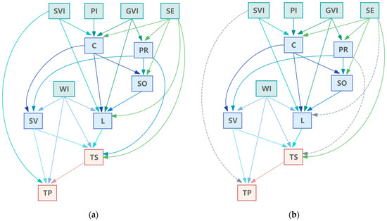 The blacklist and whitelist data frames were created to define the black- and whitelists, and the hc () function was used to perform a hill climbing algorithm to find the best Bayesian network for constructing the directed acyclic graph DAG (Figure 5a). Since the variables did not all conform to a normal distribution, it was not possible to determine the strength of the relationship between the arcs in the network structure. Therefore, we resampled the data using the playback sampling method, applying blacklist and whitelist constraints to each sample of the relearned Bayesian network. The robustness of the network structure was evaluated using the boot.strength function. The resampling parameter was set to 200 times, the algorithm was defined as “hc” for structure learning, and the algorithm.arg function passed the black- and whitelists as parameters for structure learning. Finally, the average network structure was calculated by the averaged network function.