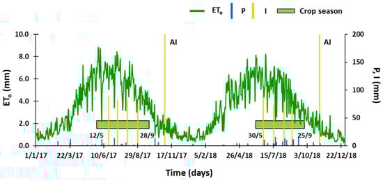 Reference evapotranspiration (ETo), precipitation (P), and irrigation (I) during the 2017 and 2018 growing seasons (AI, autumn irrigation).