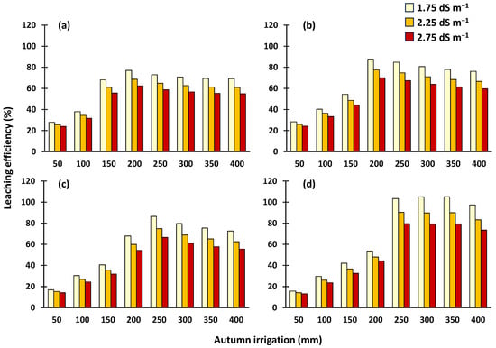 The efficiency of autumn irrigation depth for leaching rootzone salts under variable water table depth (WTD) conditions in a scenario where groundwater salinity (ECgw) increased 0.5 and 1.0 dS m−1 compared to present conditions (1.75 dS m−1 as observed in 2018). (a) WTD = 1.25 m; (b) WTD = 1.5 m; (c) WTD = 2.0 m; (d) WTD = 2.25 m.