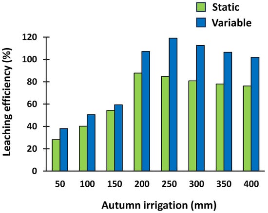 Ramos et al. [] showed that, for a WTD of 1.25 m, leaching efficiency never exceeded 78%, which was achieved with 200 mm of autumn irrigation (Figure 2). Similarly, the lysimeter with a WTD of 1.5 m exhibited the highest leaching efficiency (83.5–87.5%) with an autumn irrigation depth of 200 mm. In both cases, higher irrigation depths were less effective at salt removal due to increased salt loading in the root zone and poor drainage conditions. These results are consistent with the findings of Minhas et al. [], who discussed the limited effectiveness of leaching in the presence of shallow and saline water tables unless subsurface drainage is employed. Conversely, for a WTD of 2.0 m, leaching efficiency improved from 67–68% to 86% as the autumn irrigation depth increased from 200 to 250 mm. However, further increases in irrigation depth became less effective for salt leaching. A WTD of 2.25 m showed the most favorable drainage conditions, with a marked increase in leaching efficiency when small increments above 200 mm were applied. With 220 mm of irrigation (+20 mm), leaching efficiency increased from 51–54% to 85–91%. With 250 mm of irrigation (+50 mm), all salts applied during both the growing and non-growing seasons were removed. However, leaching efficiency decreased again to below 100% with 400 mm of irrigation.