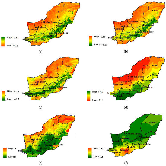 Remote sensing indicators for desertification modeling, (a): NDVI, (b): NDSI, (c): TGSI, (d): Chrips, (e): WEHI, (f): Groundwater and (g): Land use.