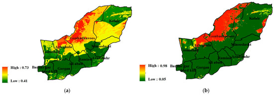 The study area, spanning 20,367 square kilometers, is geographically located between 36°25′ and 38°08′ North latitude and 53°50′ and 56°18′ East longitude. This region is bordered by the Turkmen desert to the north, the Caspian Sea coastal plain to the west, and the Alborz mountain range to the south (Figure 1). The highest and lowest elevations in the region are approximately 3813 m above sea level (Shahkoh Mountain) and −32 m below sea level (Gomishoan Lagoon), respectively. The average annual precipitation, average evaporation, and average temperature of the region over a 30-year period (1993–2023) were estimated to be 530 mm, 1338 mm, and 17.3 °C, respectively. The De Martonne (1926) and Ivanov (1941) methods classified the region’s climate as arid and steppe, respectively.