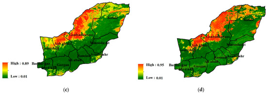 Desertification in northeastern Iran using different models in the SDM package. (a), (b), (c), and (d) are models GBM, GLM, RF, and SVM in 2023, respectively.