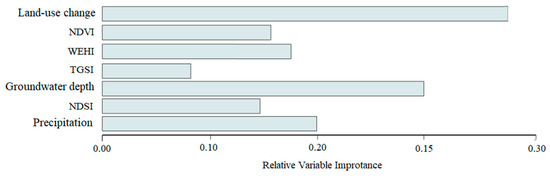 Identifying the factors influencing desertification is crucial for managing and preventing this phenomenon. A thorough analysis of these factors allows researchers and environmental managers to model desertification-prone areas more accurately. This, in turn, supports the development of effective strategies to combat desertification. Accordingly, the significance of the indicators used in desertification assessment was determined based on the ensemble model. The process of combining the models was based on the weighted averaging method, where the weight of each model was determined according to its prediction accuracy. Then, the importance of variables was calculated through the weighted combination of the base model results. This approach allowed us to more accurately identify the variables influencing desertification. The variable importance plots presented in the article demonstrate the impact of the key variables that were influential across all models. The results showed that, in order of importance, land-use change, groundwater depth, precipitation, WEHI, NDVI, NDSI, and TGSI are the most influential factors in the region’s desertification (Figure 5). Based on these findings, utilizing scenarios such as land-use change and precipitation can be effective in identifying areas prone to desertification and formulating strategies for its control and prevention