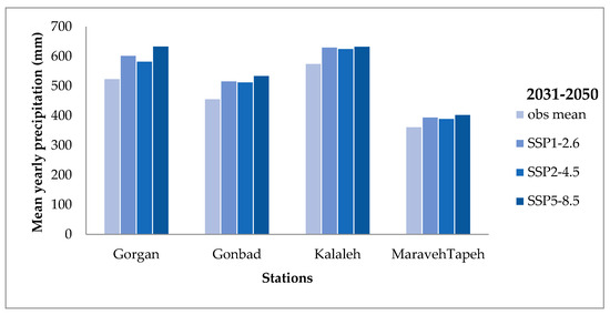 To predict desertification in 2040, assuming other parameters remain constant, the average changes in precipitation during the period of 2031–2051 and land use were simulated. Results from the CNRM-CM6 model indicate an increase in precipitation across Golestan Province in the future period. The findings showed that under the SSP1-2.6, SSP2-4.5, and SSP5-8.5 scenarios, annual precipitation at the synoptic station in Gorgan is expected to increase by 78.5, 58.11, and 109.78 mm, respectively, during the 2031–2050 period. At the Gonbad station, precipitation is predicted to increase by 59.99, 56.20, and 78.12 mm under these scenarios. Similarly, at the Kalaleh and Maraveh Tappeh stations, precipitation is expected to rise, with increases of 55.26, 50.55, and 57.99 mm at Kalaleh, and 33.55, 28.42, and 41.30 mm at Maraveh Tappeh, assuming the realization of the climate change scenarios (Figure 6 and Figure 7).