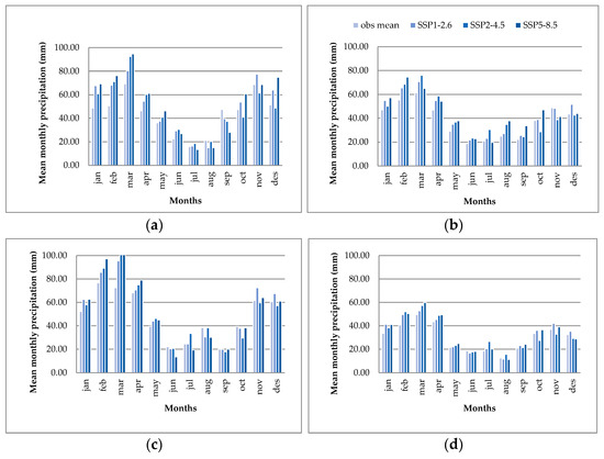 Monthly precipitation prediction using different scenarios for the period of 2031–2050 in (a) Gorgan station, (b) Gonbad station, (c) Kalaleh station and (d) Maraveh Tappeh station.