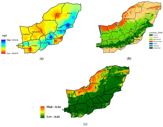 (a) Rainfall scenario in 2040, (b) Land-use scenario in 2040, and (c) Desertification in 2040.