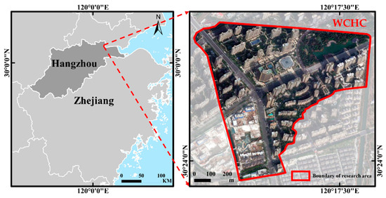 Waterview Community, Hangzhou City (WCHC) (120°17′1″ E–120°17′36″ E, 30°23′56″ N–30°24′27″ N), is located at the intersection of Century Avenue and Xinghe South Road, Linping District, Hangzhou, Zhejiang Province, China (Figure 1). The topography of the area is generally gentle, forming a separate catchment unit defined by major transportation arteries. The buildings in the catchment unit are predominantly used for residential purposes, with a relatively regular building layout, and the percentage of impervious surfaces is close to the percentage of pervious surfaces. The total community area is 0.50 km2.