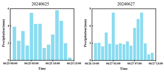 Rain barrels were deployed in the study area to obtain measured rainfall data as model input data. Two measured rainstorms, on 25 June 2024 and 27 June 2024, were used as model simulation validation data, and the above data were used as input data for the hydrological model (Figure 3).