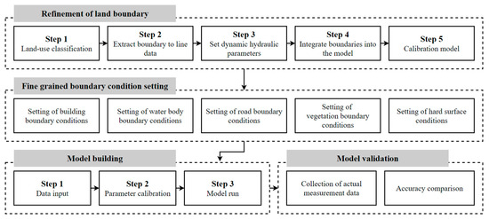 The methodology used in this study consists of four parts: the land boundary, fine-grained boundary condition setting, model construction, and model validation. The specific method flow is shown in Figure 5. (1) The boundaries first need to be determined based on land use classifications (buildings, water bodies, roads, vegetation, and hard surfaces); then, the boundary line data need to be extracted, and the basic hydrological parameters need to be set. (2) The boundary conditions are set according to the boundary type. (3) The data are input, the model parameters are set, and the hydrological model is run. (4) The measured data are obtained, and the model results are organized and compared. The research methodology given above aims to improve the accuracy and rationality of the urban hydrological process simulation by fine-tuning the boundary conditions of the land features.