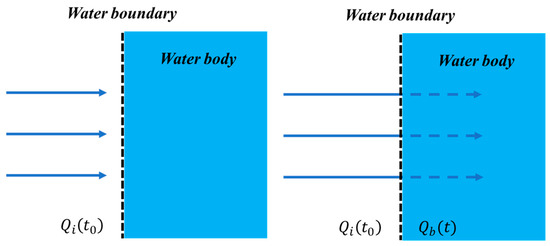 In this study, the water level change is not considered when performing the boundary condition setting of the water body, which is regarded as an open boundary; thus, there is no need to consider the water flow inside the building boundary during the boundary condition setting. Standing water enters the water body through other boundaries, and the model needs to accurately describe the magnitude of the standing water flow at the inlet and its time-series to reflect the actual precipitation or surface runoff. Once standing water enters a water body, the total capacity of the water body and the potential risk of overflow need to be considered, even though the water level remains relatively stable. Diffusion equations within the water body should also be included to depict the distribution of standing water in the water body. The method can ignore downstream boundary conditions and deal with the subsequent flow or dispersion of standing water. With this setup, the model is able to efficiently simulate the spreading behavior of standing water in urban environments, providing important information about the direction of the standing water flow and spreading patterns under long-term average conditions, even without tracking the instantaneous water level changes [59]. This simplified approach is suitable for scenarios where the impact of standing water needs to be quickly assessed; however, the impact of water level changes on the spread of standing water needs to be reassessed in the face of extreme precipitation or the near saturation of the water body. The interaction of the water body boundaries with standing water is shown in Figure 8.
