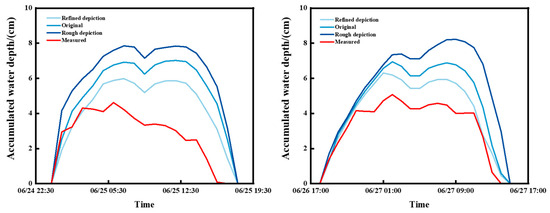 - The accumulated water depth change curves for three boundary condition scenarios of the refined depiction, original simulation, and rough depiction were compared using the measured precipitation as the validation data. The results show that the accumulated water curves of the refined depiction scenarios for the 20240625 and 20240627 precipitation events were the closest to the measured curves, with mean absolute errors of 0.60 cm and 0.49 cm, respectively, and the smallest overall errors. The rough depiction scenarios had the largest errors of 1.35 cm and 1.33 cm, respectively. From the results, it can be seen that compared with the original and rough depiction, the results of the refined depiction have higher accuracy, which is improved by 28.1% and 16.5%, respectively. Therefore, it is proved that the model after the refined boundary can simulate the real hydrological situation of the city under heavy rainfall conditions.