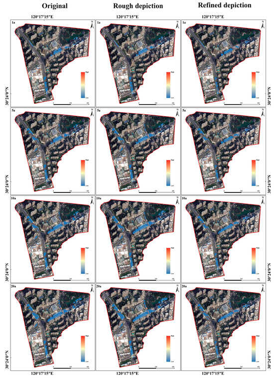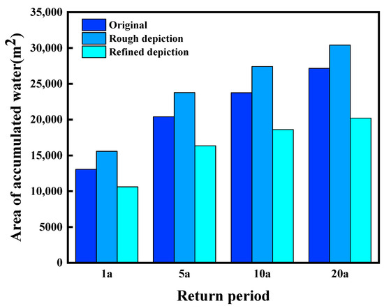 - Three boundary condition scenarios, the refined depiction, original simulation, and rough depiction, were simulated over four precipitation return periods, 1a, 5a, 10a, and 20a. The results show that the simulated accumulated water area in the rough depiction scenario was significantly larger than that of the other two scenarios as the return period increased. The refined depiction scenario had the smallest extent of accumulated water and was more realistic because it took into account factors such as vegetation infiltration and changes in the water velocity to avoid the excessive spreading of accumulated water to features where it should not be. The difference in the average accumulated water area between the refined and original scenarios amounted to 21.45%, while the difference in the average accumulated water area in the rough depiction scenario amounted to 32.18%. Overall, the refined depiction scenario provided the most accurate simulation results for the extent of the accumulated water during each return period.
