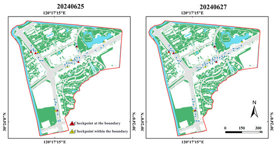 Based on the modeling results, this study obtained the resultant maps of the accumulated water spreading direction for two precipitation events after the boundary condition refinement (Figure 12). During the 20240625 precipitation event, the accumulated water was mainly distributed on the road, and the direction of flow of the accumulated water inside the boundary was mainly influenced by the topography, with the water flowing from high to low, whereas the direction of the flow of the accumulated water around the boundary was influenced by the boundary conditions, with the direction of flow changing to some extent. During the 20240627 precipitation event, the main accumulated water situation was the same as that of the 20240625 precipitation event in terms of distribution on the road; however, due to the large amount of precipitation in this area, the accumulated water spread to other land features within the boundary. At the same time, the accumulated water flow within the boundary of the interior followed the physical laws of the boundary, and the accumulated water on the boundary was affected by different boundary conditions. In terms of the direction of the accumulated water, when the accumulated water interacted with the building boundary, its direction was perpendicular or opposite to the original direction. After the water interacted with the water body boundary, the diffusion process ended as the accumulated water entered the water body. When the accumulated water interacted with the vegetation, roads, and hard surface boundaries, its direction changed irregularly.