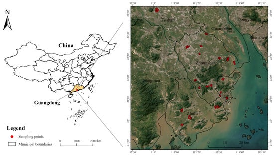 The study area is located in Foshan, Zhuhai, and Zhongshan in the Pearl River Delta of Guangdong Province, with a geographical range of 22.03° to 22.94° N and 113.01° to 113.62° E. The terrain is predominantly flat, with higher elevations in the center and surrounding low-lying areas. The average annual temperature is approximately 22.5 °C, and the annual rainfall typically ranges from 1800 to 2000 mm. This region belongs to the subtropical and marine monsoon climates and is marked by prevailing southeast and northeast winds. The primary soil type is red soil, which is generally acidic. With similar heavy metal concentrations, acidic soils present a higher risk of pollution compared to alkaline soil [24]. Since the introduction of the reform and opening-up policy, this area, recognized as a significant economic triangle in China, has experienced rapid industrial, agricultural, and aquacultural development, resulting in notable pollution challenges. Soil sampling was conducted in potentially contaminated areas based on the distribution of typical industrial enterprises and the prevailing wind direction (Figure 1).