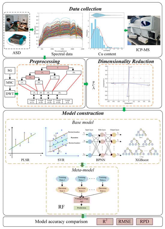 Therefore, this study focused on typical copper-polluted agricultural soil in the Pearl River Delta. We utilized CWT for spectral preprocessing to reduce spectral noise and applied PCA to lower the dimensionality. A stacking ensemble model was created using SVR, PLSR, BPNN, and XGBoost as base models, with RF as the meta-model to predict the Cu content. This ensemble model was then compared to the individual models to evaluate its effectiveness, enhance the accuracy of soil heavy metal content estimation, improve the robustness and generalization of the inversion model, and provide a solid framework for predicting soil heavy metal content.