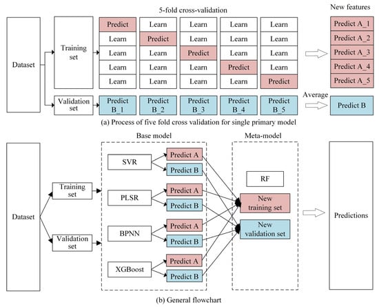 RF effectively enhances the model’s accuracy and generalization ability by constructing numerous decision trees from various subsets and features [29]. It then calculates the average of all the tree predictions to generate the final output. Moreover, the RF algorithm captures nonlinear relationships within the data and automatically evaluates the contribution of each underlying model to optimize the prediction outcomes. This study developed a stacked RF model that incorporates SVR, PLSR, BPNN, and XGBoost as base learners. SVR relies on support vectors to identify the hyperplane, making it well-suited for nonlinear fitting problems [30]. PLSR is a statistical modeling technique primarily used to analyze highly correlated and multicollinear datasets to prevent overfitting [31]. BPNN assign biases to each neuron through forward and backward propagation until the biases reach a satisfactory level, demonstrating high self-learning capabilities and a broad applicability [17]. XGBoost enhances model performance by evaluating all the feature segmentation points and selecting the optimal segmentation tree based on prior predictions [32].
