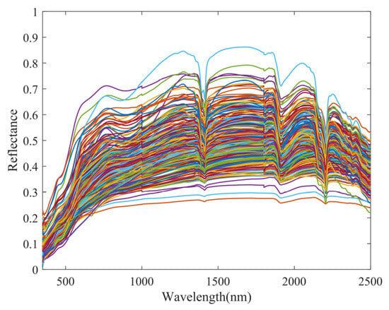 The original spectral reflectance curve of the soil samples is shown in Figure 4. The spectral reflectance varied with the increasing wavelength, displaying a consistent trend throughout. Specifically, the reflectance increased rapidly within the visible light range (400–780 nm), remained relatively stable in the shortwave infrared range (780–2100 nm), and gradually declined in the longer shortwave infrared range (2100–2500 nm). Additionally, fluctuations around 1000 nm, caused by the internal hardware of the ASD, are noticeable but can be disregarded [35]. The soil reflectance rapidly increased, starting from 400 nm, which is related to the presence of iron ions and organic matter. Absorption valleys at 1400 nm and 2200 nm are observed, attributed to the absorption of lattice water, with the latter potentially influenced by the stretching of metal hydroxyl groups [12].