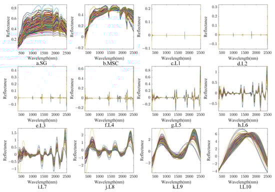 SG smoothing, MSC, and CWT were applied to the original spectral data to enhance the spectral response characteristics. As illustrated in Figure 5a, the SG method effectively removes spikes from the original spectrum, particularly in the 2200–2400 nm range. Following the application of the MSC transformation, the features of the spectral curve become more pronounced, especially at 500 nm, 1350 nm, 1800 nm, and 2200 nm (Figure 5b). The CWT method, when used to decompose the spectrum at scales L1-L10, further highlights less obvious feature peaks, with the shape of the absorption peaks reflecting the spectral characteristics. As the scale increases from L4, distinct spectral features gradually emerge. However, excessively increasing the decomposition scale may lead to the significant removal of low-frequency components, causing the spectral curve to become smoother and resulting in the loss of absorption peaks at various wavelengths (Figure 5c–l). Therefore, at excessively high decomposition scales, capturing useful characteristic spectral information becomes challenging.