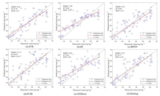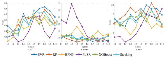 The principal components extracted through the PCA were used as input variables for the following base models: SVR, BPNN, PLSR, and XGBoost. Using RF as the meta-model, the prediction results from all the base models served as input features to construct the stacking model. Figure 6 shows the accuracy results of the validation set for all the models. Across all the decomposition scales of the CWT, the inversion results after the PCA dimensionality reduction (Figure 6a–c) indicate that, at scales L1–L5, the R2 values for most of the models were below 0.6, with relatively high RMSE values and RPD values mainly under 2, reflecting low predictive capabilities. At scales L6–L10, all the models, except for the BPNN and PLSR, exhibited a relatively good performance. The BPNN and PLSR models showed strong results only at scales L5 and L6. The validation set typically recorded R2 values between 0.6 and 0.8, RMSE values below 10 mg/kg, and RPD values generally exceeding 2. Each model achieved its highest accuracy at scale L6 (Table 4), with the training set and validation set R2 values exceeding 0.56 and 0.64, respectively. Among them, the stacking model performed the best, achieving accuracy results for the R2, RMSE, and RPD of 0.77, 7.65 mg/kg, and 2.29, respectively. Compared to the SVR, BPNN, PLSR, XGBoost, and RF, the stacking model demonstrated an average increase in R2 of 0.098, an average decrease in the RMSE of 1.672, and the highest RPD value, indicating superior predictive capabilities.