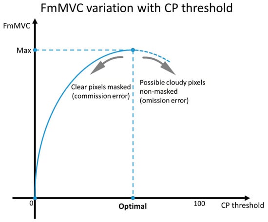 The application of the monthly MVC procedure protects from cloud commission errors (no pixels are masked), but cloud omission errors are still possible (in the case of persistent adverse weather conditions for the entire monthly sequence). However, knowing that the NDVI index takes values close to 0 in the presence of clouds and higher values in the presence of vegetation, we assume that, for each monthly MVC collection (or NDVI collection), as CP threshold increases, starting from 0 (all pixels masked), the FmMVC (or F-NDVI, i.e., the field NDVI spatial mean) increases until a maximum is reached, which represents the CP value for which all clear pixels are shown. A possible subsequent decrease in FmMVC (F-NDVI) indicates the presence of (unmasked) pixels compromised by atmospheric conditions. Then, the best balance between omission and commission errors (optimal CP threshold) can be found by setting the value corresponding to the maximum FmMVC as the CP threshold (see Figure 3).