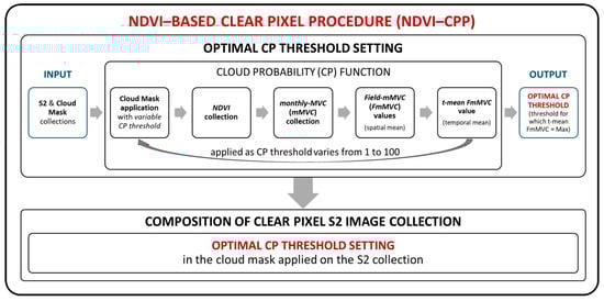 Then, we set the optimal CP threshold by taking the value for which the t-mean FmMVC was the maximum as the CP threshold varied from 1 to 100. Finally, the optimal CP threshold was applied to the S2 cloud mask collection, and the corresponding S2 image collection was composed. The implemented procedure is schematized in Figure 4.