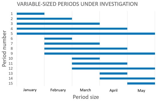Start–end months of the 15 variable-sized periods to test for the determination of the optimal reference period for yield forecast.