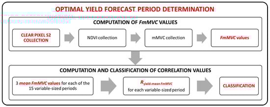 Then, to obtain a synthetic value capable of measuring the performance of each time interval, we cyclically calculated and classified the 15 Pearson correlation coefficients (R) between the three seasonal yields and the three mean FmMVC values for each variable-sized period. The steps of the method are shown in Figure 6.