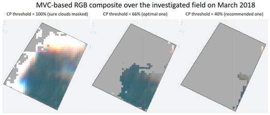 Then, by applying the 66% CP threshold value to the investigated S2 time-series, were computed all the clear pixel mMVC mosaics. Note that the t-mean FmMVC values reported on the y-axis in Figure 7 are not a reliable reference for evaluating the effectiveness of the CP threshold level, as they represent data averaged over three years, which include mostly clear-sky images that tend to flatten the values. The effectiveness of the CP threshold can only be assessed in cloudy scenes. As an example, in Figure 8, we show the difference in applying three different CP thresholds in March 2018 (which was a particularly cloudy month). The scenes displayed are the monthly RGB composites generated using the B4 (red), B3 (green), and B2 (blue) band values of the same pixels employed for the mMVC mosaics (i.e., the greenest ones).