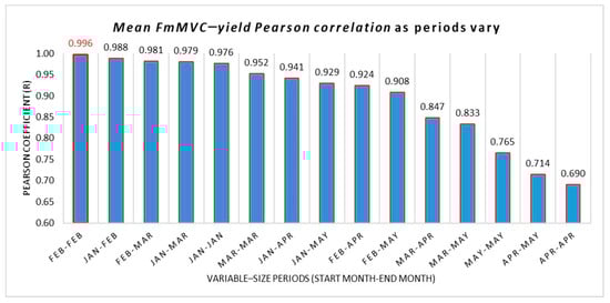 Pearson correlation coefficient mean for FmMVC–yield correlation for each of the 15 variable-sized periods sorted in descending order.