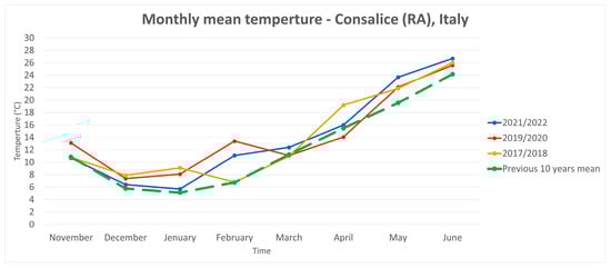 Plot of the three seasons under investigation and the average of the 10 previous seasons (starting from 2008/2009) with the monthly mean temperature of the meteorological station of Conselice (Ravenna, Italy).