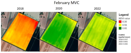 February (NDVI-based) Maximum Value Composite for the years 2018, 2020, and 2022.