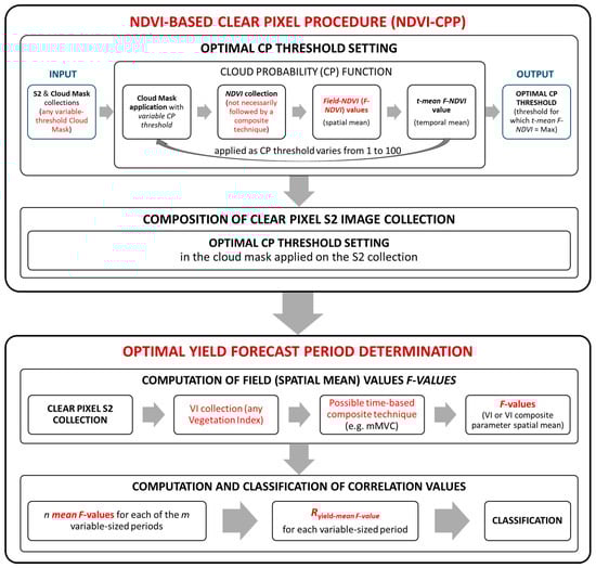 The aim of this contribution is to propose an exportable method to determine the best time period/phenological phase for field-scale yield forecasting by S2. The method can be applied to any VI and crop type. In this case, we employed the NDVI [,,], which is the most frequent index used for this purpose []. A wheat field in the Po River Valley (Northern Italy) is used as an example to show how the approach works. Fifteen variable-sized Max Value Composite (MVC) [] periods, ranging from January to May, were composed and ranked according to their ability to explain the final yield. As a preliminary step, since the study area was located in a particularly humid region, an NDVI-based clear pixel procedure (NDVI-CPP) was also developed. This procedure leverages the difference in NDVI between cloud cover and vegetation to optimize cloud detection in Sentinel-2 images by fine-tuning the cloud probability (CP) mask threshold.