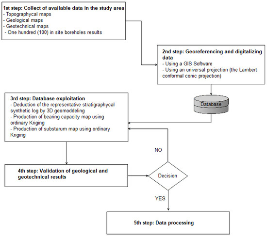 In this project, we leverage the pre-existing surveys conducted in the Casablanca region to produce comprehensive geotechnical and geological data maps for the entire research area; thus, the costs of using geotechnical test laboratories will also be minimized. While it is accurate that the individual expenses associated with these tests may not always be high, their collective expenditure can be significant. Using existing surveys collected from different stakeholders, Geographical Information Systems (GISs), and geostatistical techniques, two maps of soil and bedrock capacity for the whole study area have been generated. These maps serve a valuable purpose for planners, developers, and builders alike. In the realm of urban planning and zoning, these maps enable the assessment of the pros and cons associated with different land uses. This, in turn, aids in the preservation and optimal utilization of land resources. In spatial planning, geotechnical and geological maps play a crucial role in making informed decisions regarding proposed activities, whether they should proceed or be declined. Frequently, a soil survey is not deemed necessary prior to the creation of a master plan or even after the establishment of a site layout. However, in today’s context, geotechnical studies are considered a prerequisite. Any engineering structure, like a building, bridge, road, drainage network, dam, etc., requires detailed knowledge of the geological, geotechnical, and engineering geological properties of the foundation and the materials used for construction in order to recognize, control, and/or prevent related hazards [6]. Also useful for the builder, geotechnical and geological maps give him an idea of the problems of foundations conditioning the types of buildings and their heights.