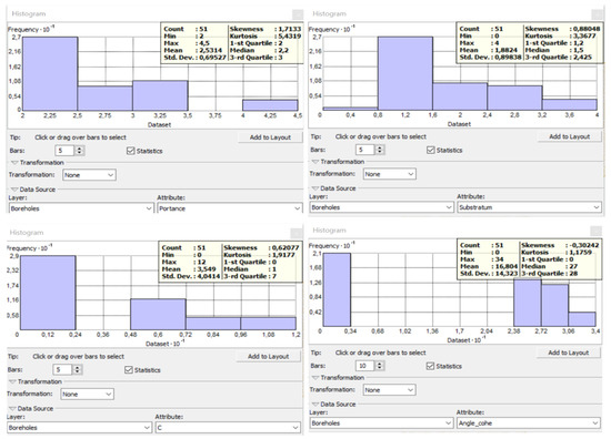 The distribution of the data, illustrated by the histograms in Figure 5, shows a heterogeneous aspect between the different existing data, with the four histograms being generally primordial, sometimes discontinuous, showing the absence of a range of values and reappearing at the level of other values. This is in full conformity and very well explained by the weathering between a rocky structure and the non-cohesive one, rather soil. Kurtosis values ranging from 1.17 to 5.4 clearly show asymmetry in the data distribution.