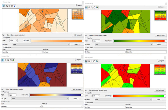 The Thiessen polygons, or Voronoi maps, shown above in Figure 7, illustrate how a space is geographically divided into polygons based on how close the data source points are to one another. Every polygon on the Voronoi map has a corresponding source point, represented by a dot on the map; all points inside that polygon are colored the same because they are closer to that point than they are to any other source point. This provides a sense of the zones of influence’s spatial distribution prior to data interpolation. These maps, as shown in the figure above, were generated for four parameters: the bearing capacity, the substratum, the cohesion, and the angle of friction. We can see from the Voronoi maps that for the same polygon subdivision, the values of the various interpolated parameters change. This allows us to draw a number of conclusions before proceeding with the choice of interpolation method.