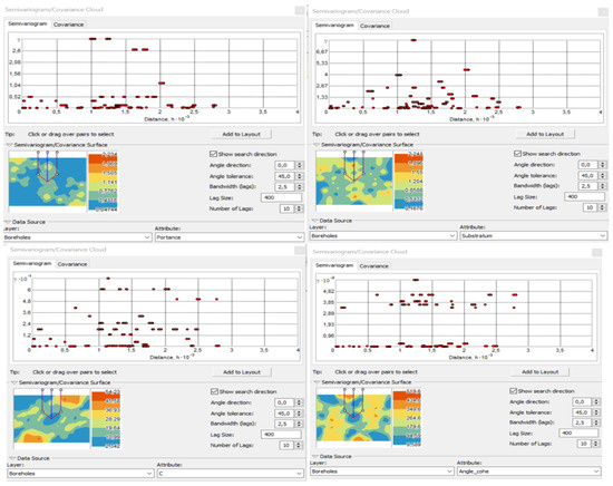 Examining the variographic surface derived from the various variables under investigation, as depicted in Figure 9 below, reveals a pronounced anisotropic behavior at a large distance, with significant variability even in the 0-angle direction—roughly equivalent to the horizontal direction of the ground. Semi-variograms occasionally show parabolic data, while other times they show heterogeneous data.