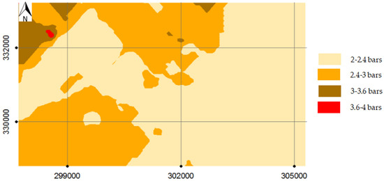 The ground lift map of the study area presented in Figure 10 was developed by the regular kriging tool available on the Arcgis Pro 10.8.2 software. This made it possible to determine the resistance of the soil at any point of the zone, assuming that the footings of the foundations are superficial. As the map shows, the ground lift varies between a minimum of 2 bars and a maximum of 4 bars. The majority of the soil is characterized by a capacity between 2 bars and 2.4 bars dominating the central and eastern parts of the area. The lift between 2.4 and 3 bars is located on the northern and southern peripheries, while the higher lifts between 3 and 4 bars occupy the northwest part. This confirms the results that give the range of lift for each type of lithology in Table 3. As already discussed in Section 2.6, the results of the studied area will be modeled on a perfectly square surface, as shown below in Figure 9. This is due to the interpolation effect, which generates average results for each interpolated survey.