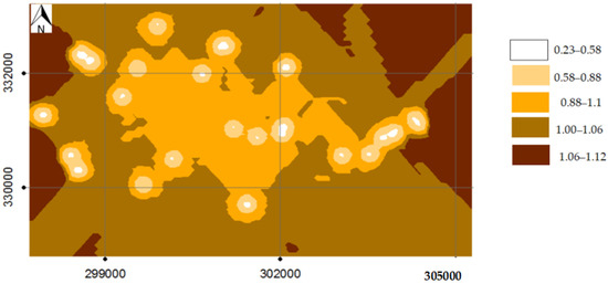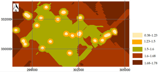 Using the same ordinary kriging techniques as before, the substratum map was generated (Figure 12). The deepest substratum is at a depth of 4.5 m, and the nearest is at a depth of 0.8 m. The majority of the terrain is characterized by a close substratum between 1.45 and 2.06 m.